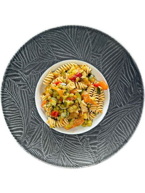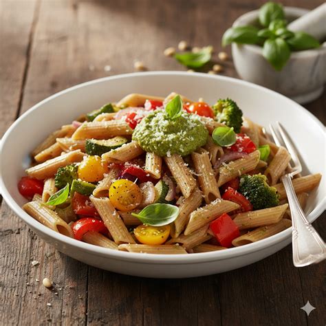 Un esempio di piatto di pasta integrale con verdure per ridurre la densità calorica.