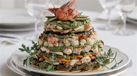 - Copritevi con strati di verdure e pesce, cospargete ogni strato con un poco di salsa e alternando gli strati anche nel colore. Creare una sorta di cupola disponendo a piacere i vari ingredienti disposti in strati alternando pesci e verdure e separandoli con un’abbondante strato di salsa verde, ad esempio: patate, salsa verde, fettine di orata, salsa verde, carote e fagiolini, salsa verde e così via fino all’esaurimento di tutti gli ingredienti.