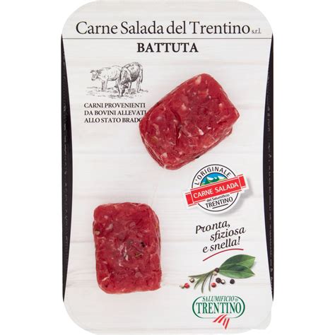La carne salada è un salume pregiato caratteristico del Trentino - Alto Adige. Si tratta di carne fresca di manzo magra e di primissima scelta (fesa, girello, magatello, scamone) conservata a secco sotto sale grosso e spezie. Questo processo avviene con l’antico metodo della salagione, conservata in un luogo buio e fresco ad una temperatura non superiore agli 8°, per circa 15 - 25 giorni e massaggiata ogni 2 - 3 giorni.