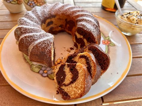 - Ciambella marmorizzata: Dividete l'impasto in due parti uguali e in una aggiungete i 2 cucchiai di cacao amaro, amalgamate per bene. Versate un pò di impasto bianco e livellatelo. Versate un pò di impasto al cacao, poi ancora quello bianco, poi di nuovo quello al cacao.