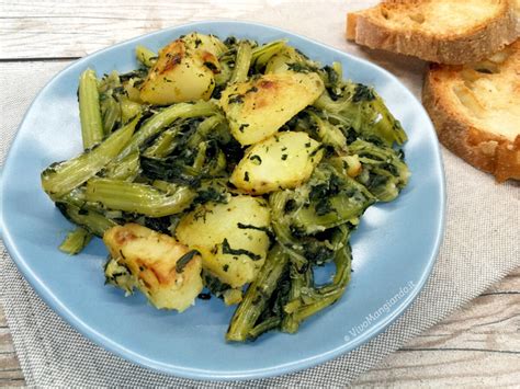 - Amalgamate bene le patate alle verdure e fate cuocere, aggiungere qualche goccia di olio o acqua se necessario, mescolate ogni tanto, appena iniziano ad attaccare sul fondo della padella le foglie e patate saranno pronte da mangiare.