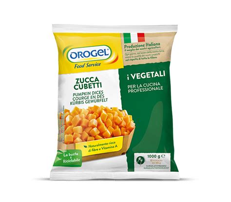 Coltivata e raccolta nelle regioni più vocata d'Italia la Zucca Orogel è proposta in comodi cubetti già pronti all'uso. Dal salato al dolce sarà facilissimo utilizzarla in numerose preparazioni. Naturalmente ricca di fibre e di vitamina A. Versa la Zucca a Cubetti surgelata in una padella con un cucchiaio di olio extravergine di oliva, due di acqua e il condimento desiderato. Copri e cuoci per 8 minuti, girando di tanto in tanto. Con la zucca a cubetti puoi cucinare rapidamente i tuoi piatti preferiti, il risotto, le lasagne, una crema. Provala anche in versione dolce per preparare una torta o un budino.