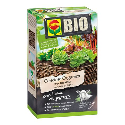 Un'ottima opzione è rappresentata da COMPO Bio Concime Organico per Insalate e orticole da foglia. La lana di pecora assicura una nutrizione per 5 mesi quindi, con una sola concimazione, le piante sono nutrite per l'intera stagione. Tale materia prima 100% naturale ha un'ottima capacità di trattenere l'acqua e di rilasciarla gradualmente. La particolare composizione naturale del prodotto fornisce sia una nutrizione immediata, sia un effetto nutritivo prolungato fino a 5 mesi. Compo Bio Concime Organico con Lana di Pecora aiuta a crescere piante sane e rigogliose, ad ottenere frutti sani e gustosi, a favorire la formazione di humus fertile e a formare una parziale riserva d'acqua disponibile nei momenti di siccità. È consentito in agricoltura biologica.