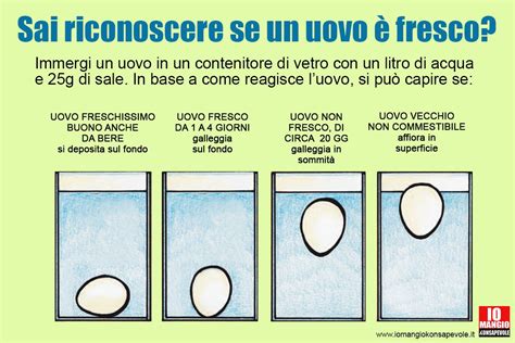 - Test dell'acqua salata: Inserire l'uovo in un recipiente con acqua e sale. Se l'uovo affonda e rimane sul fondo, è fresco. Se galleggia, è meglio non consumarlo.