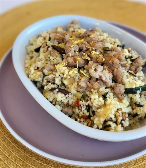 Iniziate lavando le verdure, tagliate a fettine e grigliate. Condizionale con olio e sale e tagliatele con una forbice da cucina. Trascorso questo tempo sgranate il cous cous con una forchetta. Unitelo al cous cous mescolate, in una padella sul fuoco, sistemate la salsiccia privata del budello, fate colorare pochi minuti e aggiungetelo al Couscous e le verdure. Aggiungete un po’ di olio, pepe nero e limone grattugiato e il cous è pronto. Potete aggiungere anche altre verdure a vostro piacere, olive nere, mais eccetera..