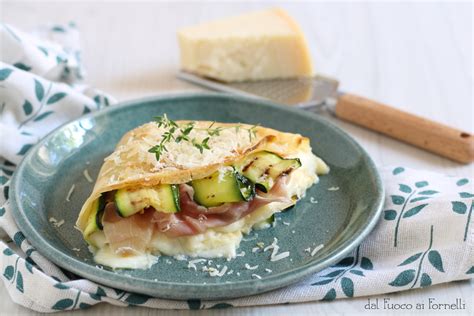 Questa è una variante di crepes salate ripiene con stracchino, prosciutto crudo e zucchine grigliate. Ecco gli ingredienti e la preparazione: