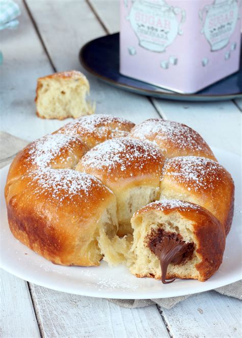 Dopo la prima lievitazione, ricaviamo dall’impasto piccole porzioni da 50 grammi l’una, le stendiamo leggermente e le farciamo con un po’ di Nutella. Apriamo leggermente ogni porzione con le mani (non serve stendere troppo) e con una sac à poche o un cucchiaino mettiamo al centro un po’ di Nutella, senza esagerare perché altrimenti potrebbe fuoriuscire. Chiudiamo i lembi in modo da sigillare la farcitura all’interno e formiamo una pallina. Mettiamo le palline su una teglia tonda da 25-26 cm di diametro coperta di carta da forno, distanziandole un po’ l’una con l’altra.