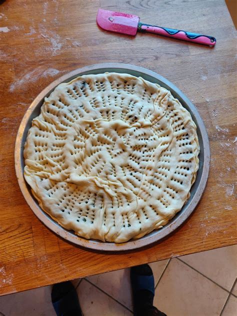 Pubblicità Dividete la pasta e tirate delle sfoglie sottili. Ungete uno stampo 22,5 x 22,5 cm con dello strutto e fate un primo strato di sfoglie sovrapponendole leggermente e facendole fuoriuscire dai bordi. Versate il ripieno distribuendolo uniformemente, e ricoprite con altre sfoglie sottili di pasta. Formate le caratteristiche grinze in superficie e rimboccate i lati al centro.