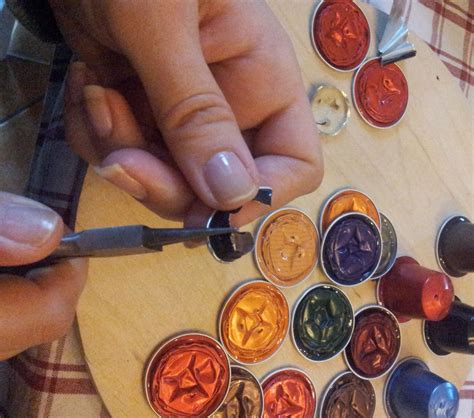 - Pulizia: Il primo passo è preparare le capsule: togli il caffè al loro interno con l’aiuto di un coltellino, sciacquale e lasciale asciugare. La cosa più importante e difficile, è riuscire a lavare bene le cialde. Consiglio di lasciarle asciugare al sole per qualche giorno così che il caffè si secchi e sia più facile da rimuovere. Mettere a bagno le cialde vuote nell’acqua e bicarbonato eliminando tutti i residui di caffè. In base ai tuoi gusti, possono essere dello stesso colore o di cromie differenti.