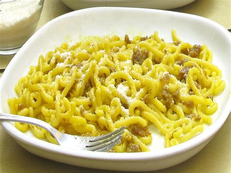 Semplice, poiché il sugo non è altro che un ragù a base di sola salsiccia che viene rosolata in un soffritto di cipolla e colorata con poca passata di pomodoro. Ad onor del vero, pare che di questo piatto esistano anche versioni in bianco, anche se l’originale è lei, quella “rossa”: un vero e proprio ragù a tutti gli effetti, ma con salsiccia fresca e nessun altro tipo di carne.