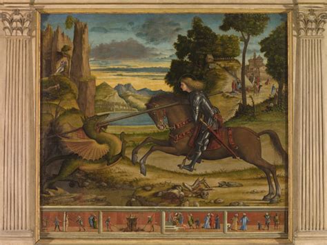Un altro capolavoro di Carpaccio è il ciclo di San Giorgio degli Schiavoni, dove il pittore raffigura le gesta eroiche di San Giorgio. Il cavaliere che trafigge il drago diventa un simbolo potente dell'epoca, rappresentando la lotta contro il male e l'invasore turco.