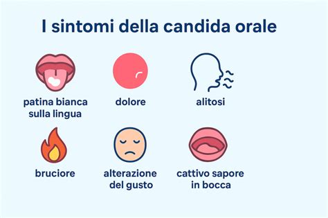 I sintomi della candidosa orale possono variare da persona a persona e anche in base alla forma clinica. In molte situazioni si nota una patina biancastra su lingua, palato o interno delle guance, talvolta con placche che possono staccarsi lasciando sotto una mucosa arrossata e sensibile. Non sempre però le placche sono evidenti: alcune persone avvertono soprattutto bruciore, alterazione del gusto o fastidio durante i pasti.