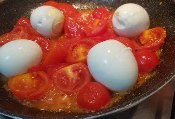 - Unire le uova e i pomodorini: Regolate di sale e aggiungete le uova sode nella padella. Proseguite la cottura per 2 minuti, muovendo le uova con delicatezza per insaporirle.