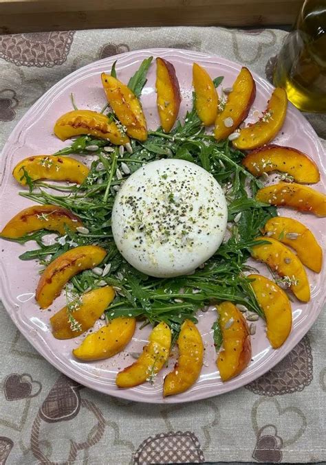 - Rompeteci sopra la mozzarella di bufala, infine disponeteci sopra le fette di pesca grigliata.