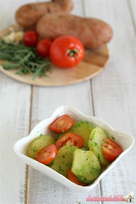 L'Insalata di patate con salsa alla rucola è un piatto estivo fresco e leggero, ma anche sostanzioso, ideale come piatto unico per la pausa pranzo, come secondo vegetariano, ma anche come contorno. Prepararla è molto facile. Dovrete tagliare a cubotti le patate e lessarle. L'insalata di patate con pesto di rucola è un piatto estivo fresco e veloce da preparare. Le patate, accompagnate da pomodorini, mozzarelline e uova sode, sono arricchite da un pesto di rucola fatto in casa.