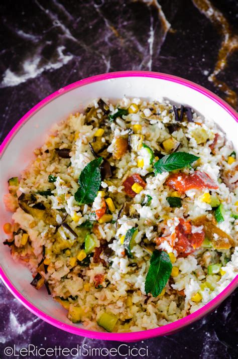 - Insalata di riso con erbe aromatiche e verdure grigliate: Un mix di erbe aromatiche (menta, salvia, rosmarino, basilico, origano e timo) tritate insieme alla scorza di limone, a un goccio di olio e a un pizzico di sale incontrano zucchine e melanzane grigliate, per un'insalata di riso leggera e profumata.