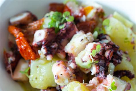 Pulite quindi il polpo dalle parti gelatinose superiori lasciando però le caratteristiche ventose e dividetelo a tocchetti. Completate l'insalata nel piatto da portata condendo il polpo e le patate in pentola a pressione con le olive e una citronette classica realizzata con olio, sale e limone.