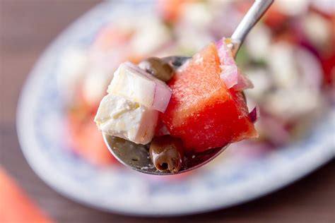 - Assemblare l'insalata: In un’insalatiera unire i cubetti di anguria, la feta, la cipolla con tutto il suo succo, le olive nere (preferibilmente denocciolate) e le foglioline di menta.