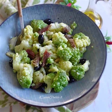 - Insalata di cavolfiore: L'insalata di cavolfiore è un contorno facile e saporito, perfetto per un pranzo in famiglia, preparato con cimette di cavolfiore cotte al vapore e condite con un pizzico di sale e un composto a base di olive verdi, capperi, aglio, prezzemolo, acciughe, succo di limone e olio extravergine di oliva.