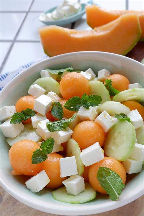 Ricetta Rinfrescante: insalata di feta, melone, olive e cetrioli.