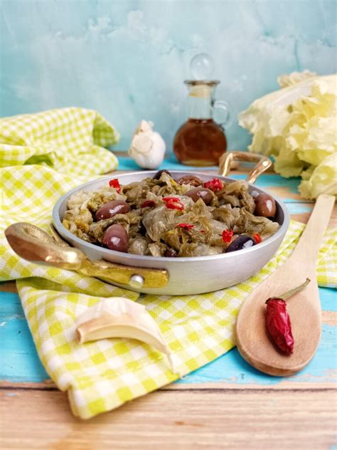 - Aggiungete la scarola poco scolata e le olive nere denocciolate e tagliate a pezzetti.