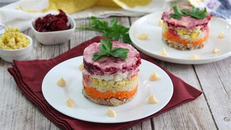 Un piatto povero: una ricetta nata per la necessità. La ricetta è stata inventata durante il periodo dell'Unione Sovietica quando in commercio c'èra una scelta d'ingredienti molto limitata. L'arte di arrangiarsi, come spesso accade, ha creato una specialità famosa oramai in tutto il mondo per l'abbinamento originale dei sapori e il suo colore brillante.