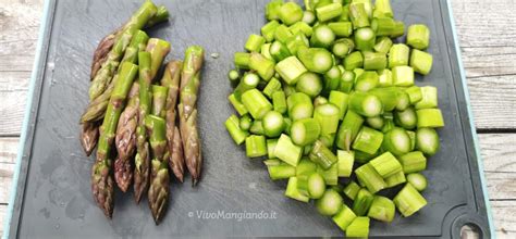 - Cottura degli asparagi: Accendere il forno a 180 gradi. Lavare e pelare gli asparagi, eliminando la parte dura e tagliandoli a metà per il lungo, o in quattro se molto grossi. Suddividerli in pezzi lunghi 6/8 centimetri e tenerli da parte.