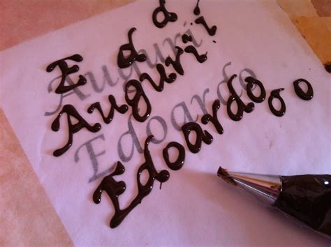 Possiamo scrivere o disegnare direttamente a mano sulla torta o usando un foglio di carta da forno: possiamo scrivere qui sopra (così se sbagliamo non lo avremo fatto sul dolce stesso), sistemando poi il foglio in frigo per far solidificare il cioccolato. Stacchiamo lettere e forme per applicarle sulla superficie del dessert. Sempre con la carta da forno, invece, possiamo scrivere sopra l’augurio e poi usarlo per ricalcare con il cioccolato fuso sulla torta.