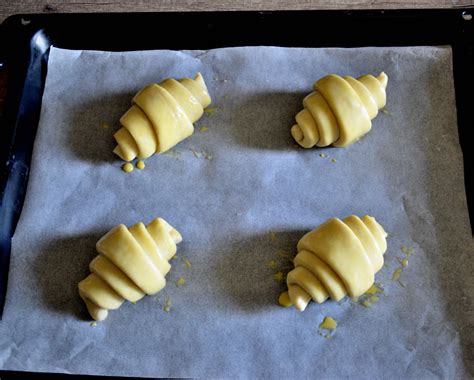 Sistemate i croissant che volete cuocere su una teglia ricoperta di carta da forno con la punta verso il basso, in modo che non si sollevi durante la cottura, distanziandoli bene, e lasciateli lievitare per tutta la notte, all’incirca 12 ore nel forno spento ad una temperatura non superiore ai 25°C, evitando così che il burro possa sciogliersi a temperature superiori.