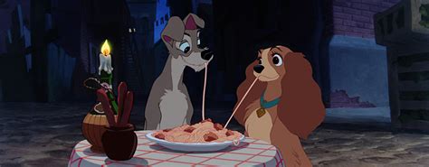 Per strada affamati, il Vagabondo pensa di fare bella figura e porta Lilly a “cena fuori” dai suoi amici del ristorante italiano. Lo chef prepara il classico piattone di spaghetti con le mitballs mentre in sottofondo si sente una musica italianissima (Com’è dolce sognar e lasciarsi cullar.. nell’incanto della notte..). Lilly e il vagabondo cominciano a mangiare finchè addentano uno spaghetto galeotto, lo stesso.