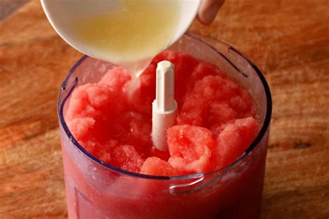 - Prelevate 3 dl di sciroppo, traferiteli in un mixer con l'anguria, i litchi sgocciolati dal liquido di conservazione, 3 cucchiai di succo di limone, l'acqua di rose e frullate.