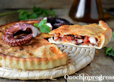 Si inizia impastando la pasta di pane. Poi si cuoce polpo e cozze. Gli ingredienti si pongono tra due sfoglie di pasta e si cuociono dorando in forno.