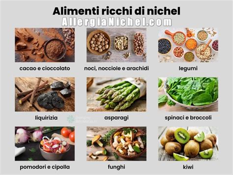 Anche se è sempre consigliabile verificare la composizione esatta, alcuni alimenti possono contenere nichel: farina integrale, farina di mais, grano saraceno, legumi, cacao, liquirizia e cioccolato, gelato, yogurt, ostriche, aringhe, sgombro e molte verdure come asparagi, funghi, cipolle (soprattutto se fritte), polenta, tutti i tipi di pomodori, broccoli (incluso il broccolo romanesco) e piselli.