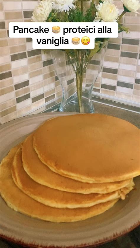Il procedimento è molto simile a quello della ricetta precedente: in una ciotola capiente, unisci gli ingredienti secchi (farina, proteine in polvere, lievito e sale). Sbatti le uova in una ciotola e unisci latte e vaniglia. Crea un buco al centro degli ingredienti secchi, versa e incorpora quelli liquidi fino a che non ci sono grumi. Scaldare una padella antiaderente a fuoco medio-alto. Una volta calda, ungere la superficie con l'olio e inizia a versa l'impasto, un mestolo alla volta. Cuoci i pancake per circa 2 minuti, fino a quando i bordi iniziano a sembrare definiti e si formano delle bolle. Gira i pancake e cuocili per altri due minuti.
