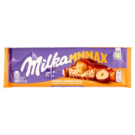 Milka MMMAX Caramello e Nocciole intere è una maxi tavoletta di cioccolato al latte ripiena di caramello, nocciole croccanti e una golosa crema di latte. Le tavolette di cioccolato al latte Milka hanno una nuova ricetta, per un'esperienza ancora più morbida al palato, un gusto ancora più avvolgente e intenso e una dolcezza bilanciata.