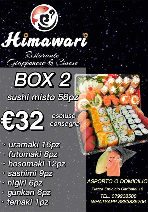 Himawari Sushi Ristorante Giapponese & Cinese a Sassari mette a disposizione il servizio Take Away e di consegna a domicilio. Potrete gustare i nostri piatti della cucina cinese e della cucina giapponese a Sassari ovunque vorrete, vi basterà comunicarci i numeri indicati nel menu per ogni pietanza che desiderate.
