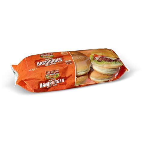 Tipici panini per hamburger con semi di sesamo nella parte superiore, la confezione è da 300 grammi con quattro panini all'interno. Sono ottimi per preparare degli ottimi panini con hamburger in casa.