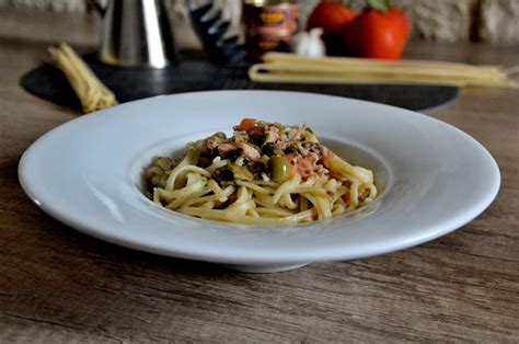 Terminati i minuti di cottura, scoliamo la pasta al dente. Buttiamo l’acqua di cottura e rimettiamo nella casseruola la pasta cotta. Quindi condiamola con il composto di olio, aglio, acciughe e peperoncino. Quindi giriamo per bene il tutto e uniamo anche il composto di pomodori, tonno e olive, insieme al prezzemolo tritato. Trasferitela in una ciotola capiente e unite la salsa alle acciughe, il composto col tonno e il prezzemolo tritato. Girate e mischiate bene tutti gli ingredienti tra loro.