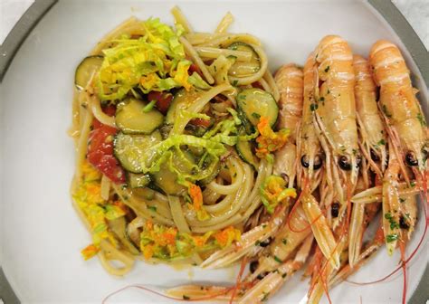 Questo piatto esalta la qualità degli ingredienti: la dolcezza delle zucchine, la succosità dei pomodorini e la delicatezza degli scampi si fondono in un connubio perfetto.