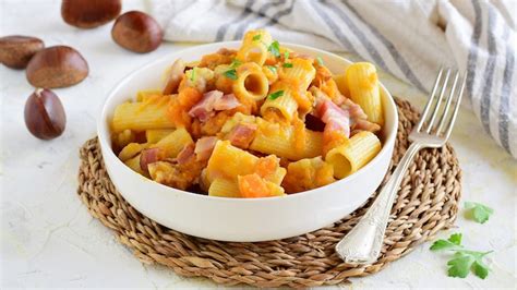 - Pasta zucca e castagne: un primo autunnale goloso e profumato, preparato con castagne bollite tritate al coltello, polpa di zucca stufata in padella con il brodo vegetale bollente, pancetta croccante e mezze maniche rigate: un formato corto particolarmente indicato per trattenere tutto il condimento.