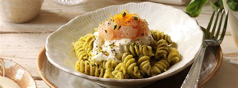 Fusilli con Tartare di Gamberi, Burrata, Pesto di Pistacchio e Scorza d'Arancia