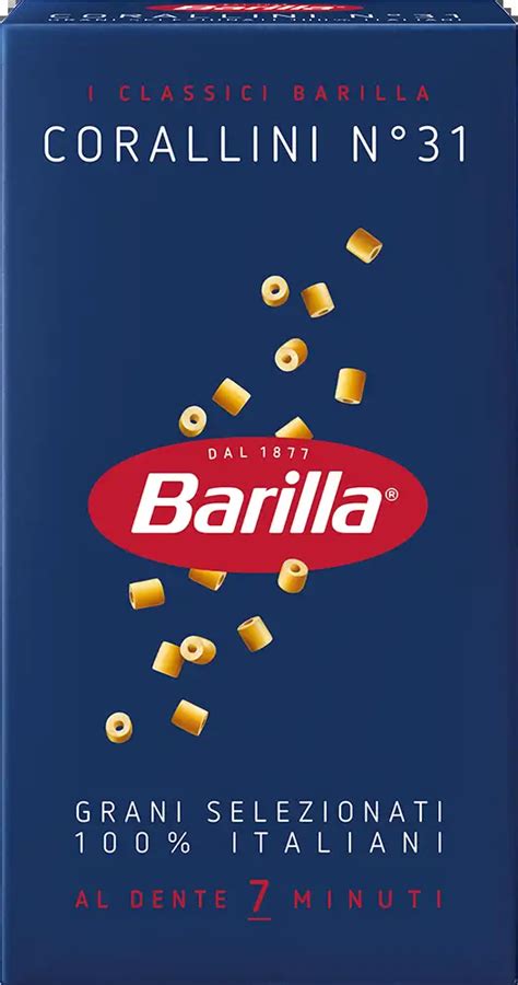 I Corallini n. 31 di Barilla sono una pasta di semola di grano duro con la forma di piccolissimi tubetti. Hanno l'aspetto elegante di piccolissimi tubetti, cortissimi e di forma liscia che richiamano un ornamento femminile. Perfetti nel trattenere brodo o passati sono l'alternativa raffinata nella scelta delle pastine. Ideali con brodi o passati, o con ingredienti saporiti. Ideali con ingredienti saporiti o in una deliziosa zuppa di mare. Poveri di sodio e grassi.