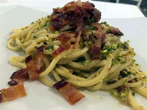 Lo chef Donato Molle, della Locanda dei Sapori a Biccari, propone una variante con troccoli, pesto di pistacchio, pomodori secchi e pancetta croccante. Un piatto semplice e appagante.