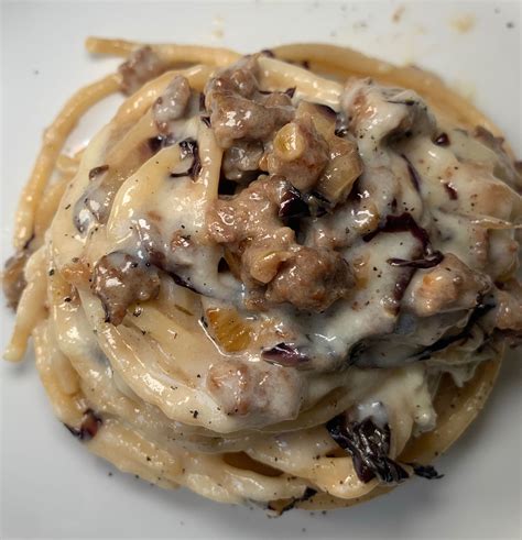In una padella antiaderente scaldate l’olio e lo scalogno e unite il radicchio precedentemente lavato e tagliato a fettine sottili. Trasferite il radicchio appassito nel mixer e frullate bene. Unite la salsiccia fresca fatta a pezzettini, salate e pepate. Scolate la pasta al dente, versatela nella crema ottenuta e impiattate!! Mi raccomando, da mangiare calda e fumante!!