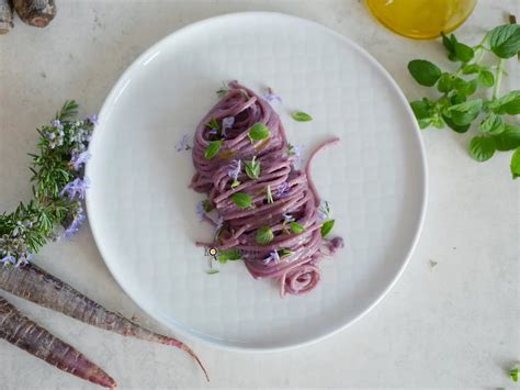 - Aggiungi la pasta al dente e fai insaporire nell’olio aromatico, unisci poi la crema di carote viola e fai insaporire ancora fin quando gli ingredienti saranno bene amalgamati.