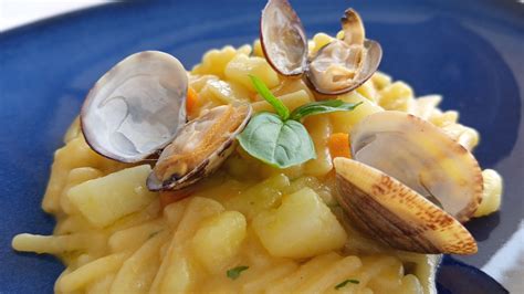 - Risottare la pasta: Cuocete la pasta direttamente nella casseruola con le patate, come fosse un risotto: versate poca acqua o brodo per volta, mescolando spesso e mantenendo il fuoco medio. A metà cottura, aggiungete l’acqua filtrata delle vongole per insaporire. Unite alla pasta il liquido delle vongole.