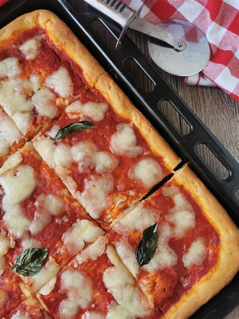 Riprendete la pasta, oleate la leccarda da forno e trasferite l’impasto stendendolo uniformemente. Infornate nel forno precedentemente preriscaldato statico a 250 gradi per 20 minuti, aggiungete la mozzarella a dadini, le foglie di basilico, un filo d’olio e infornate nuovamente per altri 5 minuti giusto il tempo che si sia fusa. Concludete con un filo d’olio. Tagliate a tranci e servite.