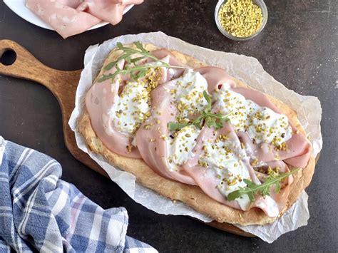 - Una volta sfornata, distribuite su tutta la superficie il pesto di pistacchio, le fette di mortadella e la stracciata di bufala.