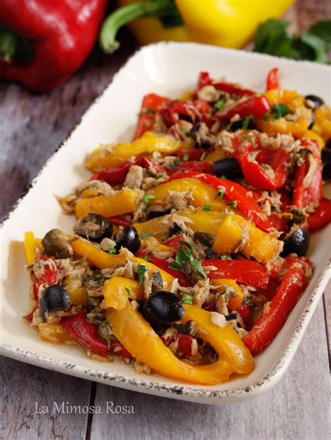 - Sbriciolare il tonno sgocciolato sopra i peperoni.