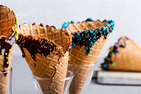 Queste cialde e coni per gelato sono perfetti anche per servire mousse e macedonia. L'importante è farcirle al momento, per evitare che assorbendo l'umidità del contenuto si ammorbidiscano.